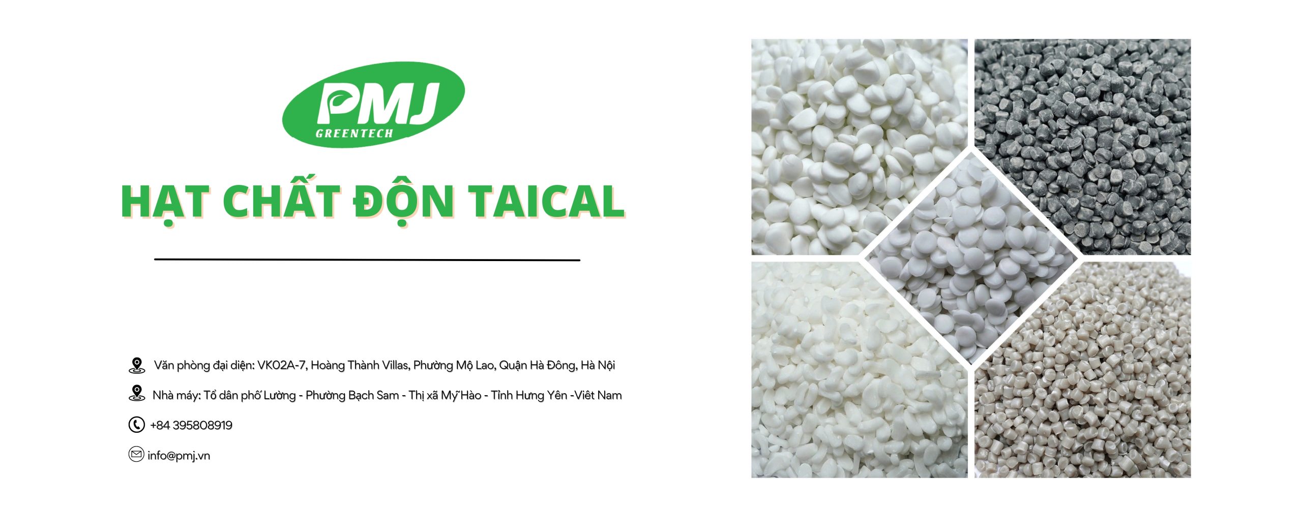 Hạt nhựa màu cô đặc: (Color masterbatch) là một nhóm quan trọng trong danh mục sản phẩm của PMJ GREENTECH. Hạt nhựa màu cô đặc của PMJ GREENTECH được sản xuất trên máy hai trục vít với các loại bột màu và phụ gia chất lượng cao trên tất cả các nền nhựa theo yêu cầu của khách hàng.